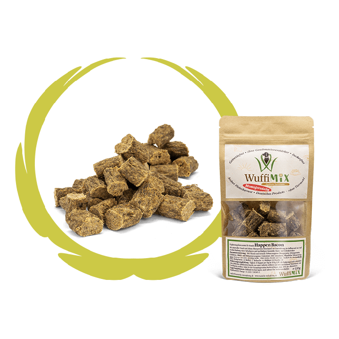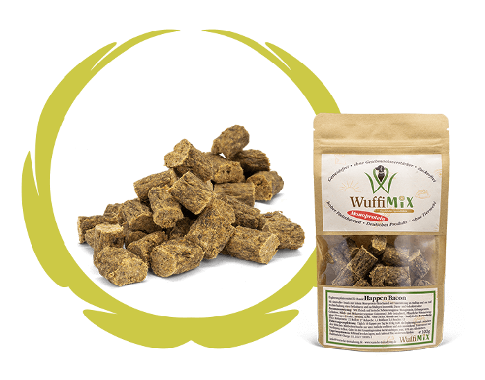 WuffiMIX Happen Bacon sind eine optimale Alternative für Hunde die gegen Rind oder Lamm eine Unverträglichkeit haben.